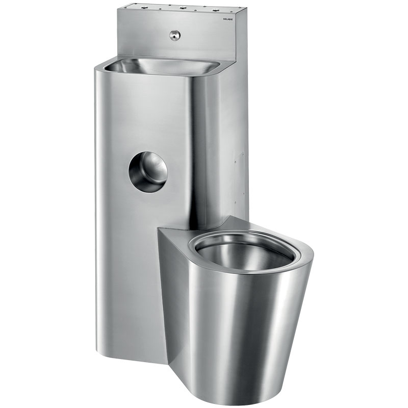 Le WC est entièrement soudé au lavabo, pas de vis : facilite le nettoyage et empêche la dissimulation d’objets.