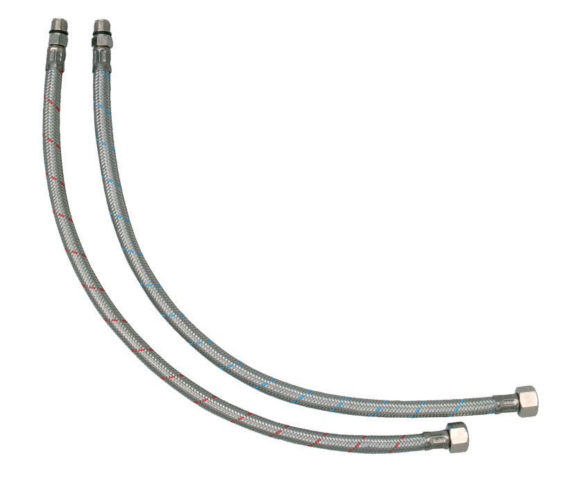 Raccords flexible F3/8" M10x1 L.420 mm en gaine Inox tressé avec âme PEX Ø 6 pour alimentation des robinetteries sanitaires.
