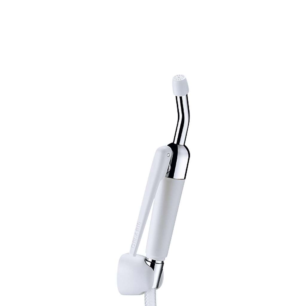 Douchette HOSPITAL à gâchette inversée avec embout démontable et incliné à 30° : écoulement si gâchette relâchée (obligation de refermer le robinet d'arrêt en fin d'usage afin d'éviter le risque de mise en pression constante du flexible).
