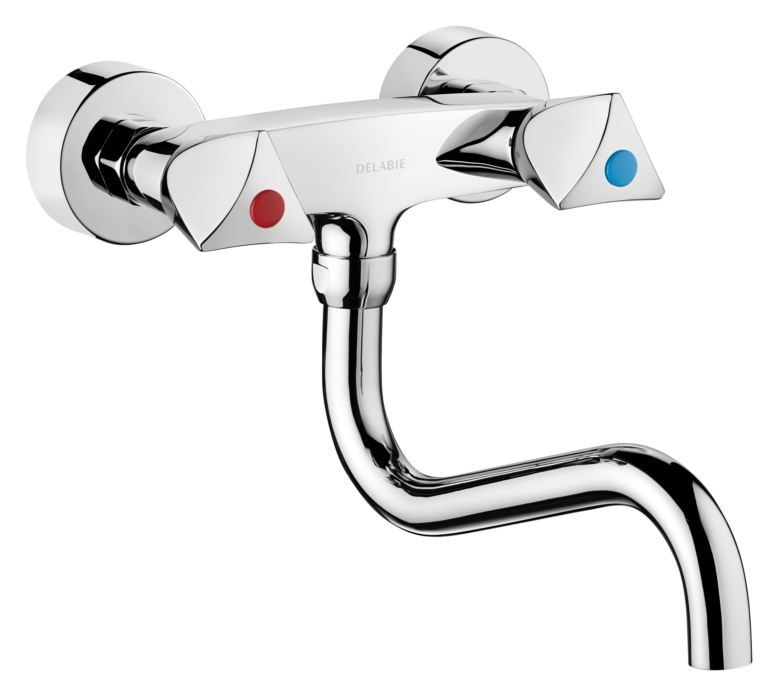 Réf. 5445T2SMélangeur mécanique d'évier mural avec bec tube orientable par-dessous Ø 22 L.200 avec brise-jet étoile laiton.