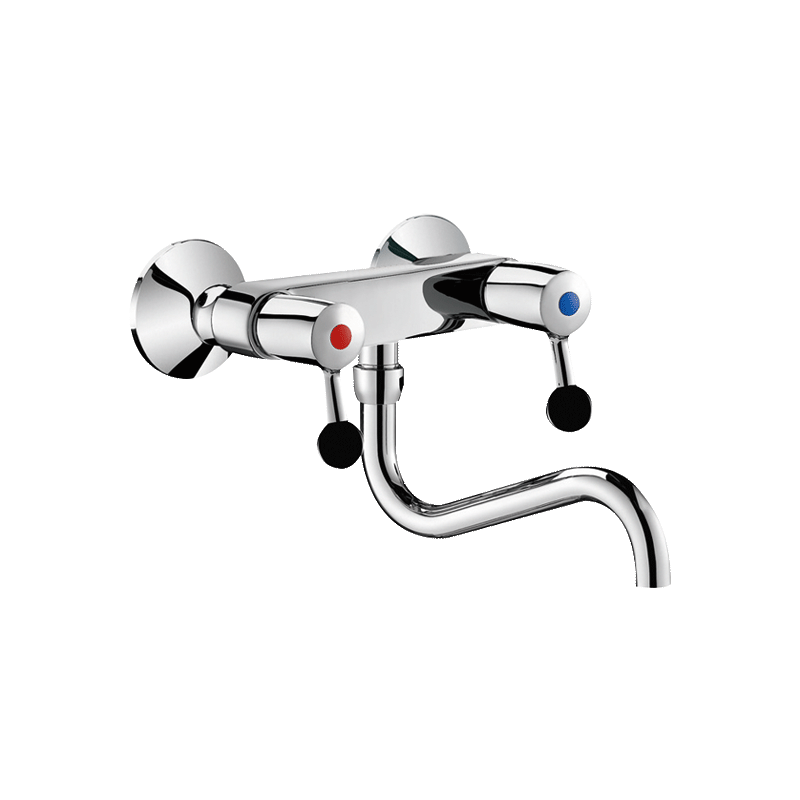 Réf. 5645T2Mélangeur 2 trous mural avec bec tube orientable par-dessous Ø 22 L.200 avec brise-jet étoile laiton.